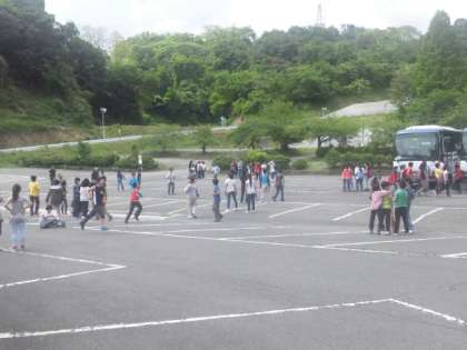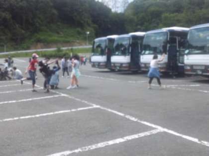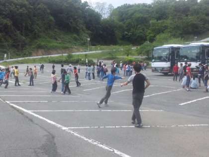 駐車場 集合です。集まってきた生徒たちは、また鬼ごっこで走り回っています。