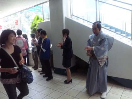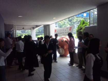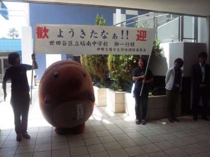 高速道路を走り、鳥羽水族館に到着しました。水族館の入り口で、現地の伊勢志摩学生団体誘致委員会の皆さんの歓迎を受けました。キャラクターがユニークです。