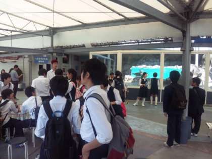 水族館では、魚に直接触れる水槽がありました。強く握らないで、さわるだけです。魚はいいとして、タコやナマコはちょっとヒヤヒヤです。大きなエイが跳びはねてビックリ。生徒は悲鳴をあげながらチャレンジしています。