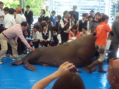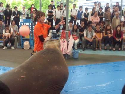 生徒が輪投げでセイウチが受け止めるというパフォーマンスが大いに受けていました。本人は冷や汗ものですが。