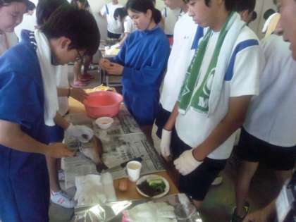 鯛のうろこを取る、下ごしらえから始めます。同時に、卵の白身をとって、塩と混ぜ合わせます。