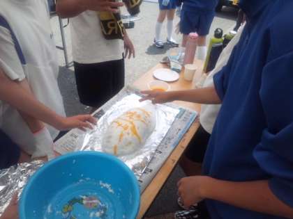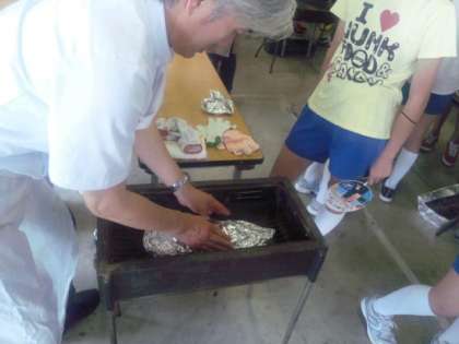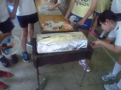 なぜか卵黄で絵を描いてから、最後にアルミホイルでおおって、炭火で焼きます。上におおいをかぶせます。