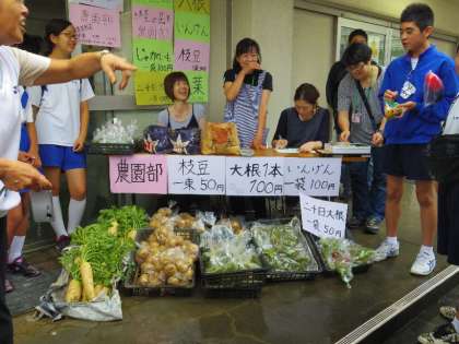 7月5日、南中バザー(PTAバザー)が行われています。雨模様のあいにくの天気ですが、10時の開始と同時に大勢のお客さんがお見えです。野菜、フランクフルト、チョコバナナ、フルーツサイダー、フライドポテト、おにぎり、パン、カレー、やきとり、焼きそば、綿あめ、クッキー、犬用クッキー、古本、ポップコーン、日用品、衣類………
