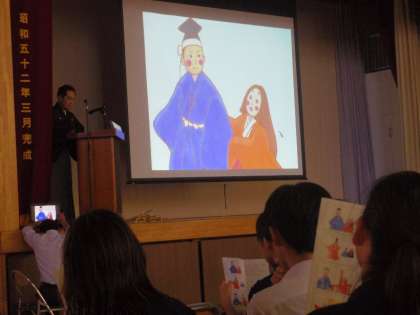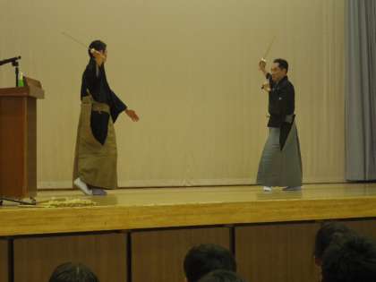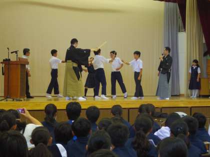 後半は「船弁慶」の一部分を謡(うた)ったり、それに合わせて代表の生徒が演技したりしました。