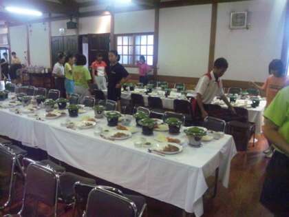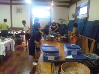 初日の練習が終わりました。夕食の準備にかかります。ここの宿舎のお風呂は温泉です。さっぱりして、夕食です。涼しい風が食堂に入って来ました。