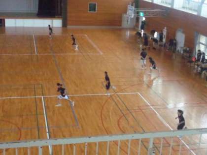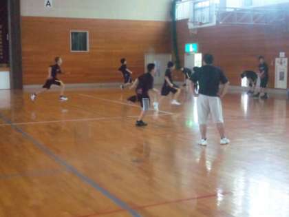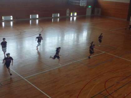 ホイッスルの合図で、ダッシュの練習。体育館の中は比較的涼しいですが、子どもたちは汗をぬぐいながら、走っています。
