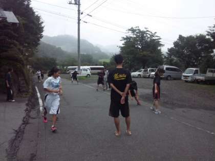 合宿二日目です。夜中は大雨でしたが、今朝は霧雨程度。天気予報では、暑くなるとか。