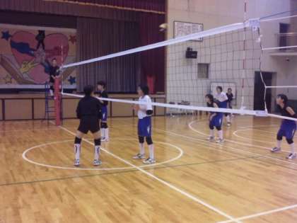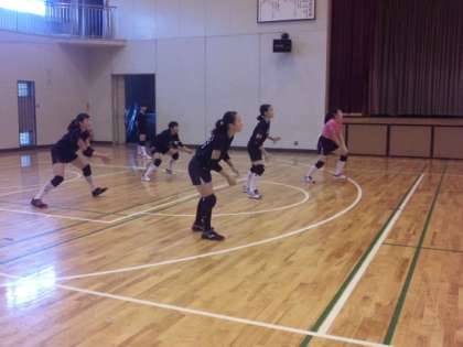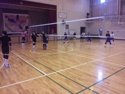 バレーボール部の練習会場に来ました。今日は体育館前にある武川中学校のバレーボール部と練習試合です。第一セット僅差で勝ちました。