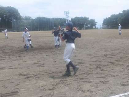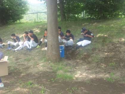 練習が続く内野の選手たち。お昼のお弁当になった外野の選手たち。