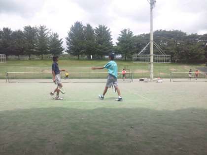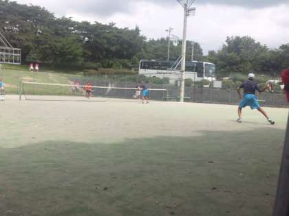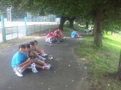 ソフトテニス部は昼食中。関東大会に向けて練習試合をする選手たちもいます。空には入道雲が登って来ました。