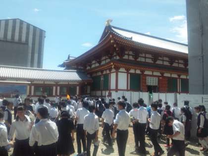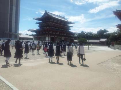 薬師寺では、講話があり、お寺の由来や、生きていく上でのお話を伺いました。ものごとがつまらないと、顔を下向きにしているから、面が倒れた状態で面倒。楽しいと顔を上げれば、顔に光が当たって輝くから、面白い。
