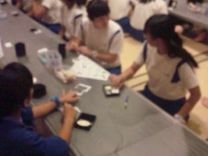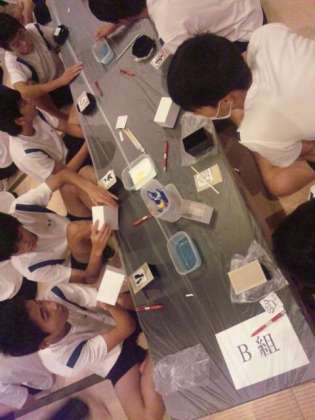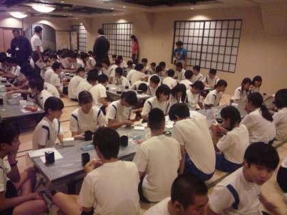 夕食が終わりました。大広間で体験学習が始まりました。今日体験するのは、漆器の絵付けです。下絵の準備から始めます。