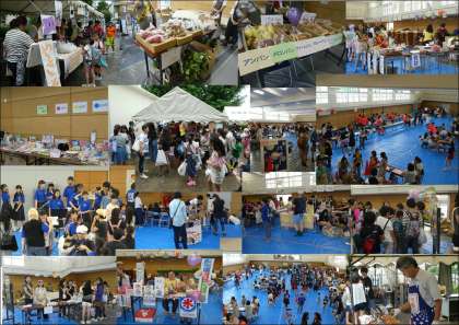 焼きそば、やきとり、新鮮野菜、パン、おにぎり、飲み物、フランクフルト、フルーツサイダー、クレープ、かき氷、綿あめ、などの食品、日用品、食器、衣類、古本、ミサンガ、エコアクセサリーなどなど…人気商品は早々に完売していました。