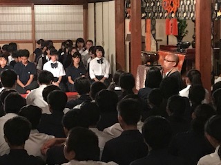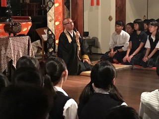 高台寺のご住職から、講話をうかがいます。高台寺の歴史や思いやりの心の大切さ、生き方、在り方のお話をされました。