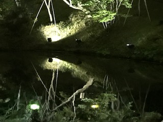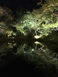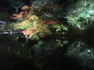 写真では、分かりにくいでしょうが、高台寺のライトアップで、池に映る木々の姿です。