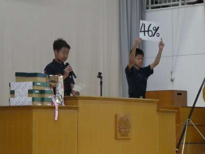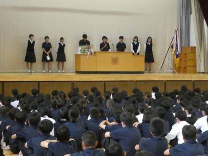 6月18日、生徒会朝礼が行われました。7月7日に行われるPTAバザーに出店する部活動から、それぞれの出し物についての説明があり、生徒会本部から「あいさつ運動」などについての話がありました。