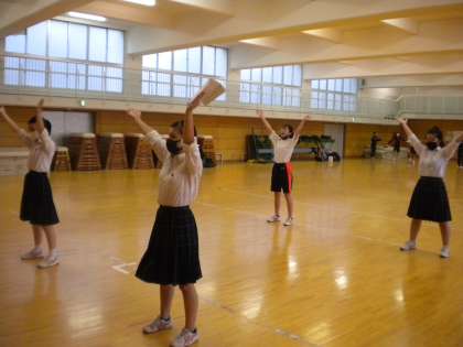 体育祭、3年生女子は「YMCA」を踊ります。5分と長い曲ですが、ダンスリーダーが考えた、見ている人を飽きさせない隊形移動が見所です。最後に、1・2年生と3年生とで互いのダンスを発表し合いました。