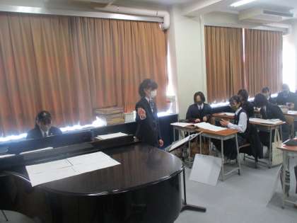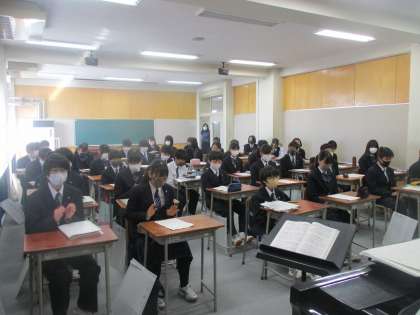 合唱コンクールで歌う予定だった曲で、ボディパーカッションによる発表会をクラスごとに行っています。手足だけでなく、段ボールを利用して多種多様な音を奏でて合奏しました。指揮者、伴奏者は冬休みから練習に取り組んでいました。