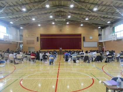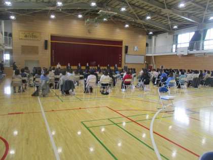 全体会では、校長のあいさつ、教務主任、進路指導主任などの話があり、その後職員紹介となりました。