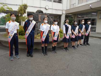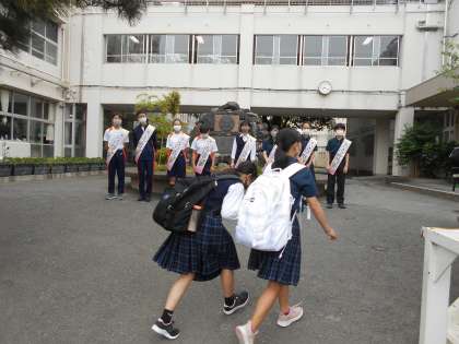 本来ならば、「学び舎 小中連携」として、小学校と共にあいさつ運動を行うところですが、緊急事態宣言の発令のため、それぞれの学校で実施しています。