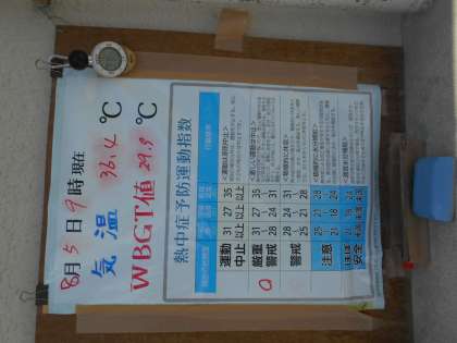 本日も熱中症警戒アラートが発令されました。WBGT値の確認をまめに行い、適宜水分補給と日陰での休憩、スプリンクラーの活用をして部活動を行っています。