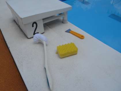 快適な水質で活動が出来るように、教員がプール側面についた苔を取るなどのプール清掃を行っています。毎日塩素も入れています。