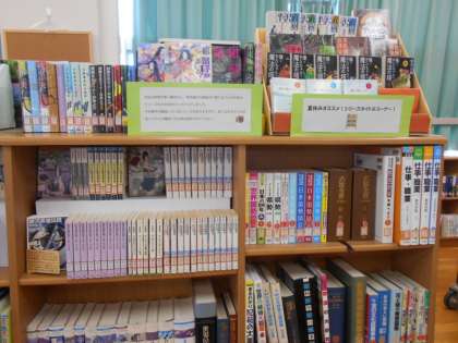また、先日入った新刊も続々と貸し出されています。この夏休みに読んで欲しい「司書からのお勧めシリーズ本」のコーナーは人気シリーズが揃っています。