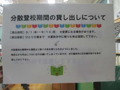 夏休みの長期貸出期間は終わりましたが、分散登校中も一人5冊借りられるようにしました。ぜひご利用下さい。