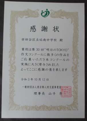2・3年生が夏休みの宿題で取り組んだ「明日のTOKYO作文」の主催財団から、感謝状が贈られました。