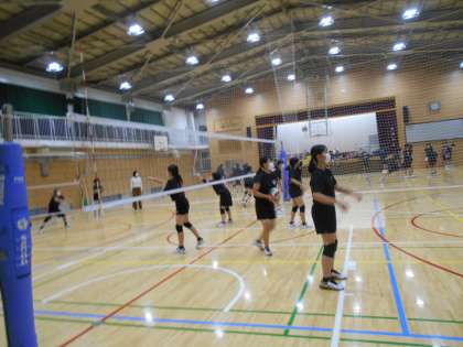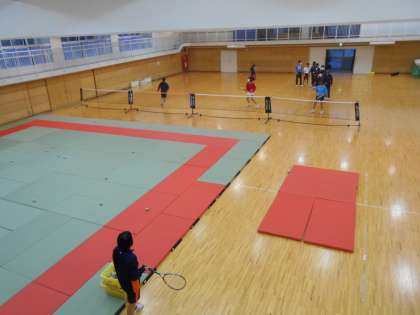 雨のため、ソフトテニス部は格技室で練習を行いました。