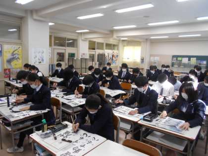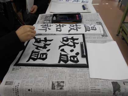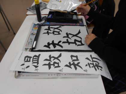 3年生は、書き初めの課題が「温故知新」(楷書)と「躍動する心」(行書)です。美術室をお借りして取り組みました。