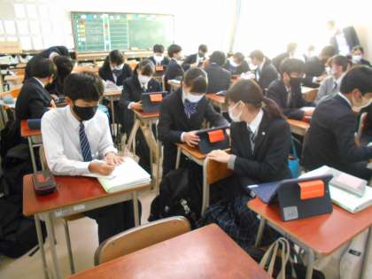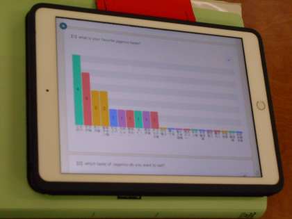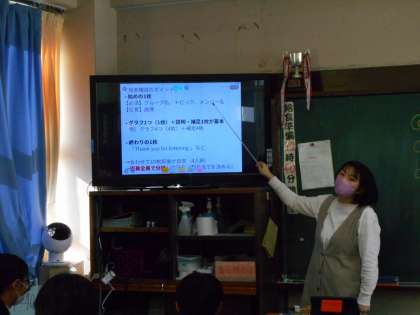 iPadのロイロノートを活用し、グループごとにアンケートを実施します。質問内容は「一番好きなクリスマスケーキは? 1、ショートケーキ 2、チョコレートケーキ 3、タルト」などです。質問の回答をまとめ、その結果をパワーポイントを使い、比較の表現を用い英語でw発表します。