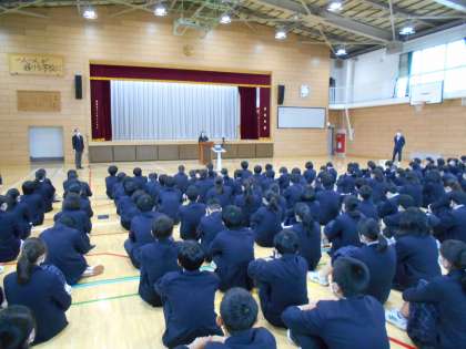 2年生は体育館で、1・3年生は各教室にてZoomで式を視聴しました。
