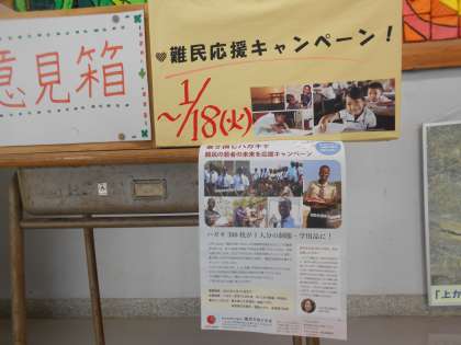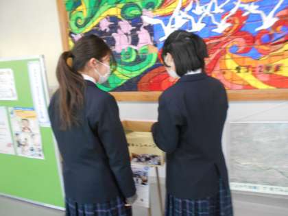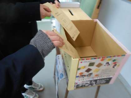 2学期の終業式や3学期の始業式で生徒会役員から呼びかけがあった「書き損じはがき等の回収」のBOXを生徒玄関に設置しています。本日も書き損じはがきを持ってきてくれた生徒がいました。