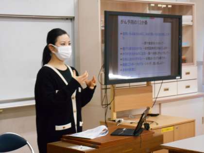 この2つを達成するため、井本さんからがんについての基本的な知識や食習慣・生活習慣に大切さを話していただきました。講演会後、がんに関するリーフレットも読み合わせこれからの生活をどうすればよいかを考えました。