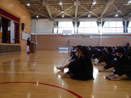 1年生が体育館に集合し、2・3年生は各教室で校長先生の話を聞きました。