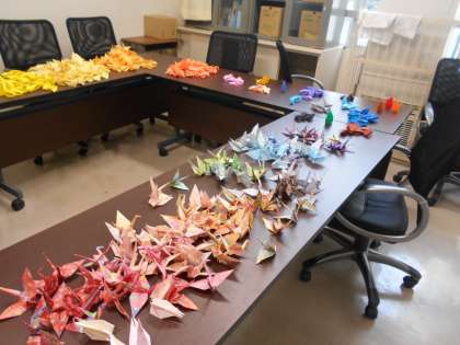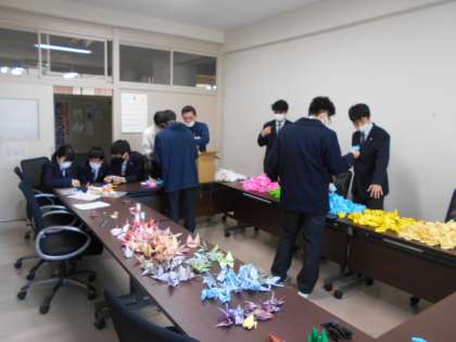 生徒が作成した鶴を実行委員の人たちがまとめています。