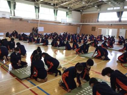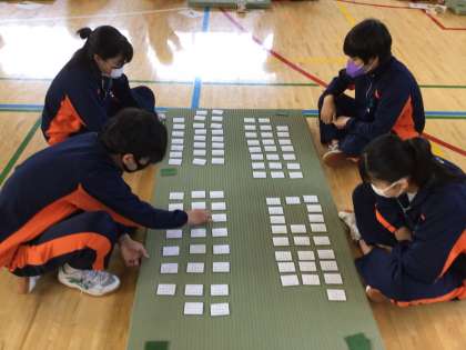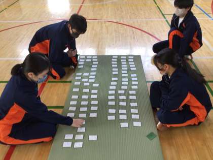 自分の得意な札が取れて喜ぶ生徒の声やほんの僅かの遅れで取ることが出来ず嘆く生徒の声がいたるところから聞こえてきます。どの生徒もクラスの優勝のために1枚でも多く取ろうと必死に頑張っています。1番人気の札「ちはやふる」はどのタイミングで読まれるのでしょうか。
