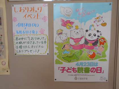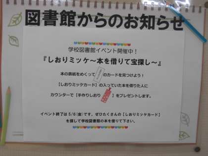 今週から「しおりみっけイベント」を行っています。「しおりみっけ」の用紙が入っている本を借りたら、オリジナルしおりをプレゼントします。ぜひ図書館に来て本を借りてください。