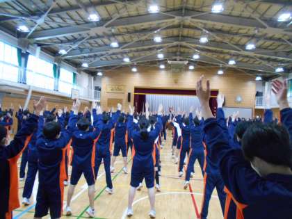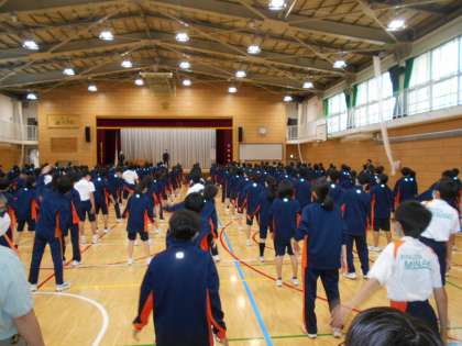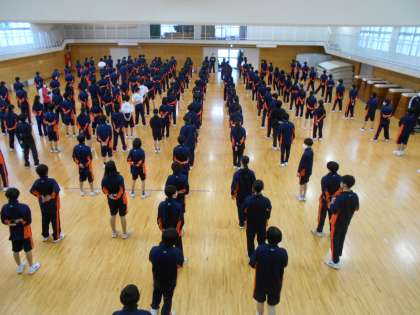 全体練習の後半は、雨が降ってきたため体育館と格技室に分かれて、ラジオ体操をしました。