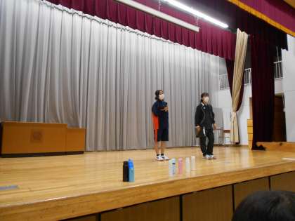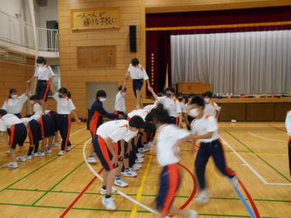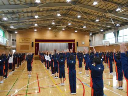 体育祭実行委員の生徒の進行のもと、ラジオ体操、全員リレーの走順確認、いかだ流しの練習を行いました。