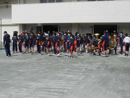 本日は、入場行進・開会式の通し練習・ラジオ体操・閉会式の通し練習を行いました。行進や表彰の練習では実際に吹奏楽の生徒が演奏しました。