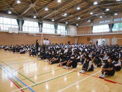 1,2年生は体育館で3年生はzoomで参加しました。