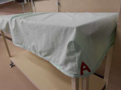 各教室に新しい配膳台カバーが配られました。家庭科部が作っています。学年カラーで作られ、一つ一つフェルトでクラスカラーのアルファベットがついています。技ありの作品です。これで、何年何組のカバーなのか、一目瞭然ですね。