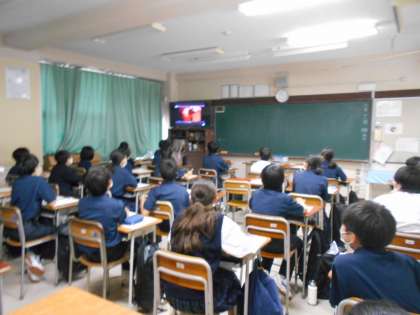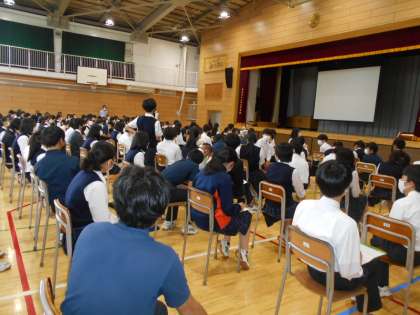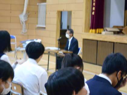 2・3年生が体育館、1年生は教室でZoom視聴しました。生徒たちは、話された内容をワークシートに記入しながら聞いていました。