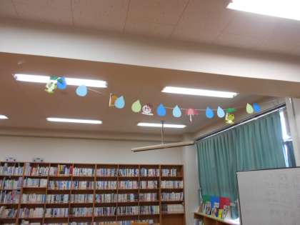天井のモビールが、梅雨バージョンに変わりました。司書と図書委員が作成しました。