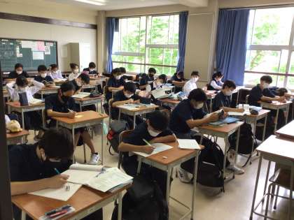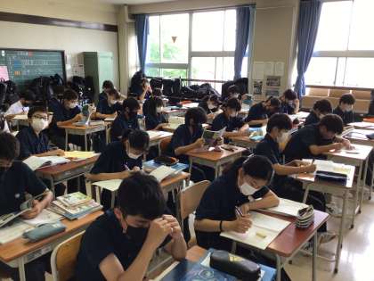 写真は集中して最後の確認を行なっている1年生のクラスの様子です。1年生にとっては初めての9教科の試験です。3日間頑張りましょう!