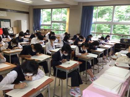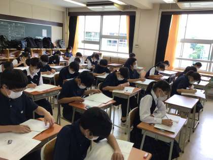 本日は英語、社会、技術・家庭の試験が行われます。英語の試験ではリスニングの問題もありました。写真はリスニング後に残りの問題に取り組んでいる2年生の様子です。