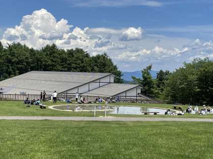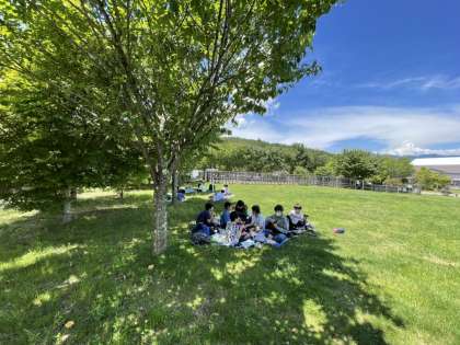 富士山レーダードームに到着後、芝生の上で昼食をとっている様子です。