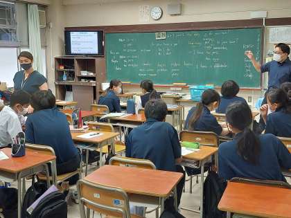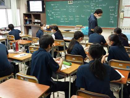 ペアで話すことで、アウトプットを行い話す力を培い、ワークシートを使い文法の振り返りとしています。教員は、机間指導を行い、苦手な生徒のフォローアップを行います。